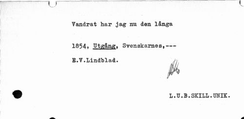 //// Vandrat har jag nu den långa 1854* Utgång, Svenskarnes,--- //// E.V.Lindblad» //// jk //// 9 L.U.B.SKILL.OTIK. ////