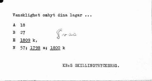 //// Vansklighet ombyt dina lagar ? //// ] //// A 18 //// B 27 //// E 1809 k, //// B 57; 1798 a; 1800 k //// KBsS SKILLIHSTRYCKSBEG. ////