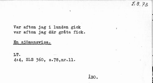 //// fr 'O% //// \ //// I ¦ //// Var afton jag i lunden gick , //// var afton jag där gråta fick. //// En s.jömansvisa. LT. //// 4:4, SLS 36O, s.78,nr.11. //// ¦ //// I //// i //// ÅBO. ; //// ¦ //// ! ////