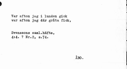 //// I //// Var afton jag i lunden gick var afton jag där gråta fick, //// ¦ ¦ //// Svenssons saml.häfte, 4:4. ? Nr.2, s.74. //// I //// ÅBO. ////