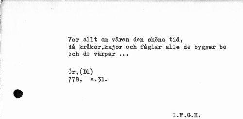 //// 1. ¦ > . . ¦ //// Tar allt om våren den sköna tid, //// då kråkor,kaj or och fåglar alle de bygger bo //// och de varpar .. ? //// Ör,(Dl) 778, s.31. //// X »3? •Gr*H# ////