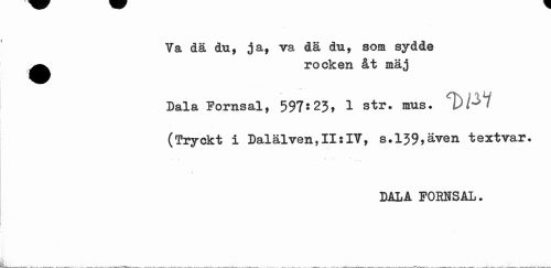 //// Va dä du, ja, va dä du, som sydde ^^ rocken åt mäj //// Bala Fornsal, 597*23» 1 str» mus. DM (Tryckt i Dalälven,II:IV, s. 139,även textvar. //// DALA POMSÅL. ////