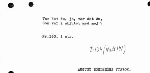 //// Var det du, ja, var det du, Som var i skjutet med mej ? //// Nr.160, 1 str. //// 2>/3V(Wm/J //// AUGUST BONDESONS VISBOK. ////