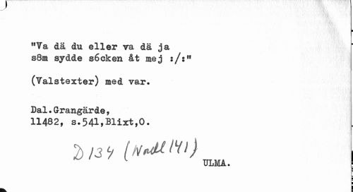 //// I //// f,Va dä du eller va dä ja s8m sydde söcken åt mej :/:w //// (Valstexter) med var. //// Dal.Grangärde, 11482, s.541,Blixt,0. //// » //// 2)/3 9 {NOllHl) \ //// 1 ULM. ' //// i ¦ //// m ////