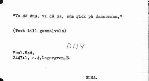 //// I //// r //// f,Va da duu, va dä ja, som gick på dansernaa,n i //// (Text till gammalvals) //// D J3 L/ //// ' r //// V //// Vsml.Hed, //// 2447*1* s.4,Lagergren,E. J //// . ' ULMA. ////