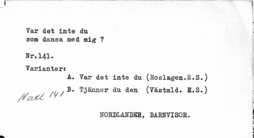 //// i //// Var det inte du som dansa med mig ? //// Nr.141• //// Varianter: //// A. Var det inte du (Roslagen.E.S.) //// B. Tjänner du den (Västmld. E.S.) //// //ovtt /{// //// NORDLANDER, BARNVISOR. ! //// F c: //// B //// l I ////