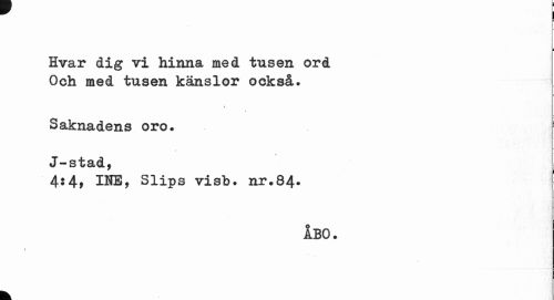 //// i //// Hvar dig vi hinna med tusen ord Och med tusen känslor också. //// i //// Saknadens oro. //// t //// * //// J-stad, : //// 4:4, IHE, Slips visb. nr.84. //// ÅBO. //// \ ////