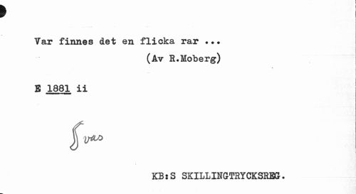 //// t //// Var finnes det en flicka rar //// (Av R.Moberg) //// v //// E 1881 ii //// KBjS skillingtrycksreg. ////