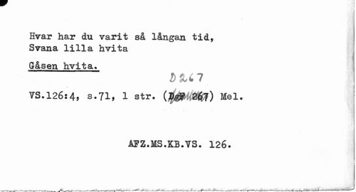 //// Hvar har du varit så långan tid, Svana lilla hvita //// •j //// Gåsen hvita. //// DU 7 //// VS.126:4, s.71, 1 Str. Stfå) Mel. //// ¦ ¦ - //// ÄFZ.MS.KB.VS. 126. //// 1 //// 1 ////