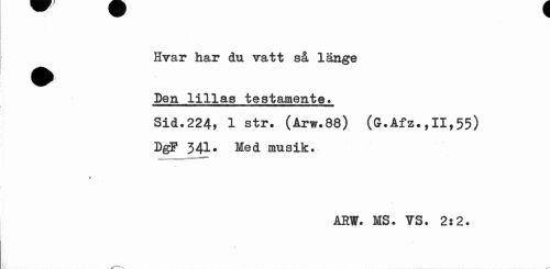 //// Hvar har du vatt så länge Den lillas testamente. //// Sid.224, 1 str. (årw.88) (G.Åfz.,11,55) //// DgF 341• Med musik. //// } //// ARW. MS. TS. 2:2. ////