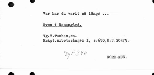 //// « ML //// Tar har du varit så längé •?. Sven i Rosengård» Vg.V.Tunhem,sn? //// Mskpt»Arbetssånger I, s»650,E.U.20475» //// ^ F 3 9 o //// NORD.MUS. //// A ////
