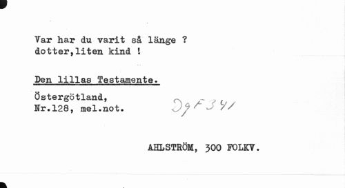 //// Var har dm varit så länge ? dotter,liten kind ! //// r •• //// Den lillas Testamente» //// Östergötland, r „ , //// Nr» 128, mel.not. ^ ^ //// AHLSTRÖM, 300 FOLKV. //// k ////