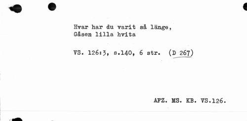 //// Hvar har du varit så länge, Gåsen lilla hvita //// VS. 126:3, s.140, 6 str. (D 267) //// iPZ. MS. KB. VS.126. ////
