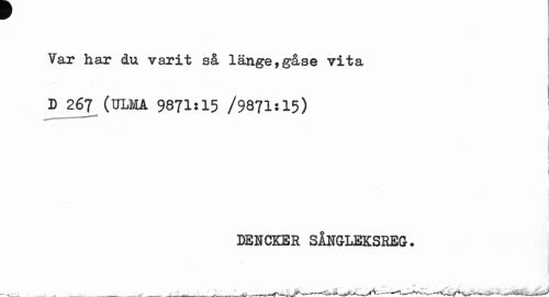 //// r //// Var har åu varit så länge,gåse vita //// i //// D 267 (ULMA 9871:15 /9871:15) //// j //// DENCKER SÅNGLEKSREG. ////