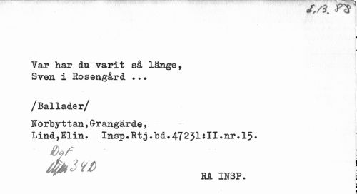 //// ^ a //// i i //// Var har du varit så länge, Sven i Rosengård ... //// /Ballader/ Norbyttan,Grangärde, //// Lind,Elin. Insp.Rtj.bd.47251:11.nr.15- //// M ? v fl 1 //// RA INSP. ////