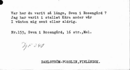 //// Var har du varit så länge, Sven i Rosengård ? Jag har varit i stallet Kära moder vår I vänten mig sent eller aldrig. //// Hr.153, Sven i Rosengård, 16 str.,Mel. //// %/-- 39a //// ! //// DAHLSTRÖM-FORSLIN, FINLÄNDSK. //// 4 J ////