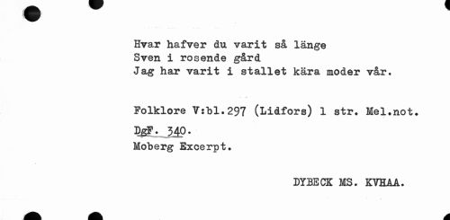 //// fl B //// Hvar hafver du varit så länge Sven i rosende gård //// Jag har varit i stallet kära moder vår. //// Folklore V:hl.297 (Lidfors) 1 str. Mel.not. DgF. 349- //// Moberg Excerpt. //// DYBECK MS. KVHAA. //// ^fe A ////