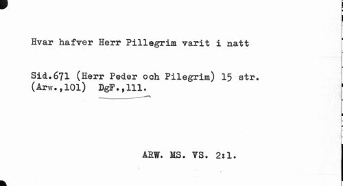 //// I //// Hvar hafver Herr Pillegria varit i natt //// Sid.671 (Herr Peder och Pilegrim) 15 str. //// (Arw.,101) DgP.,111. ' //// I //// t //// l [ //// 1 //// ARW. MS. YS. 2:1. //// / //// k. ////