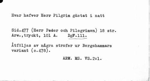 //// Hvar hafver Herr Pilgrim gästat i natt //// ! ( //// Sid.477 (Herr Peåer och Pilegrimen) 18 str. Arw.,tryckt, 101 A. DgF.lll. //// o //// Åtföljas av några strofer ur Bergshammars variant (s.47ö)* //// AHW. MS. VS.2:1. //// ^ .vi ////