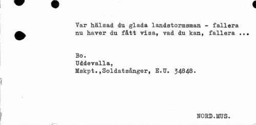 //// Var hälsad du glada landstormsman - fallera ^^ nu haver du fått visa, vad du kan, //// Bo. //// Uddevalla, //// Mskpt.,Soldatsånger, E.U. 34848. //// NOED.MUS. ////
