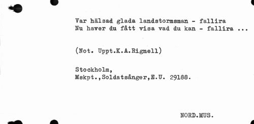 //// Var hälsad glada landstormsman - fallira Nu haver du fått visa vad du kan - fallira //// (Not* Uppt.K.Å.Rignell) Stockholm, //// Mskpt.,Soldatsånger,E.U. 29188. //// HORD.MUS. ////