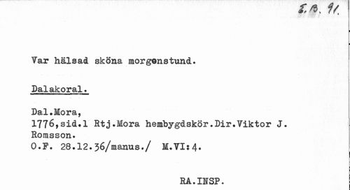 //// Var hälsad sköna morgonstund. //// Dalakoral. Dal.Mora, //// 1776,sid.1 Rtj.Mora hembygdskör.Dir.Viktor J. Romsson. //// O.P. 28.12.36/manus./ M.VI:4* //// RA.IISP. ////