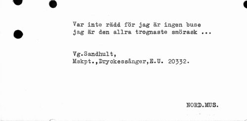 //// Var inte rädd för jag är ingen buse ^^ jag är den allra trognaste smörask .»« //// Vg.Sandhult, //// Mskpt.,Dryckessånger,E.U. 20332. //// HORD. MUS. //// •i». //// V ////