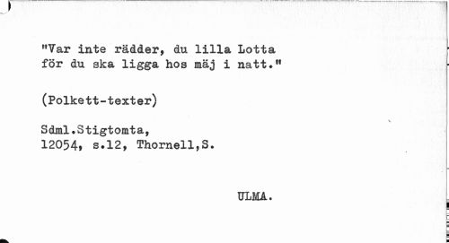 //// "Var inte rädder, du lilla Lotta för du ska ligga hos mäj i natt.n //// (Polkett-texter) Sdial.Stigtomta, //// 12054» s#12, Thornell,S. //// / //// ULMA. //// i ////