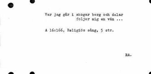 //// Var jag går i skogar berg och dalar //// följer mig en vän ... //// A 16:166, Religiös sång, 5 str. //// SÅ. //// ^ A A ////