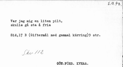 //// är'*. //// i i //// Tar jag mig en liten pilt, skulle gå sta å fria //// Sid,17 B (Giftermål med gammal kärring)9 str. //// jå^ /n //// GÖl.FÖKB. KVHÅA. //// i ////