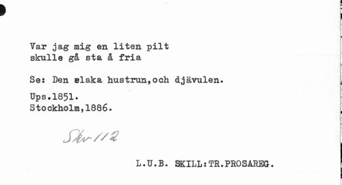 //// > //// i //// Var jag mig en liten pilt skulle gå sta å fria //// Se: Den elaka hustrun,och djävulen• L //// Ups.1851» Stockholm,1886. //// L.U.B. SKILL:TR.PROSÅREG. //// v //// I //// I ////
