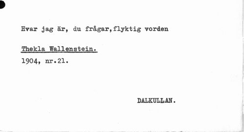 //// Hvar jag är, du frågar,flyktig vorden //// i | //// Thekla Wallenstein. //// 1904, nr.21. //// DALKULLAN. //// % j ////