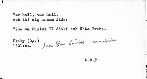 //// Tar kall, var kall, och låt mig ensam lida: //// Tisa om Gustaf II Adolf och Ebba Brahe. Ekeby, (Ög.) Q ^J/U* //// 1601:64- v0" l //// L.U.F. //// I //// 1 //// ^ i ////