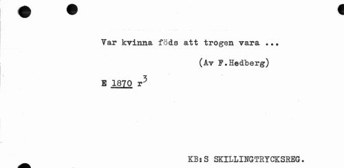 //// Var kvinna föds att trogen vara ... //// (Av F.Hedberg) //// E 1870 r5 //// KB:S SKILLINGTRYCKSREG. ////