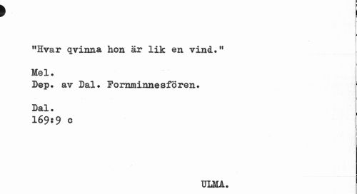 //// > I //// i //// "Hvar qvinna hon är lik en vind." //// p //// Mel. //// Dep. av Dal. Fornminnesforen. Dal. //// 169:9 c i //// I //// ULMA. ////