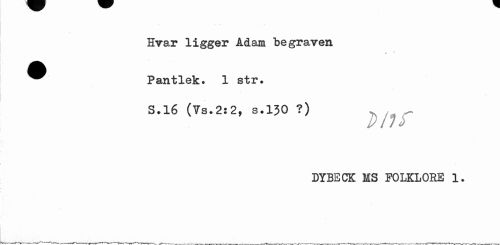 //// Hvar ligger Adam begraven //// t //// ^^ Pantlek. 1 str. //// S.16 (?s.2:2, s.130 ?) //// D/U //// DYBECK MS FOLKLORE 1. ////