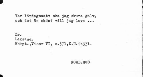 //// Var lördagsnatt ska jag skura golv, och det är skönt vill jag lova ... //// ( //// Dr. i //// Leksand, //// Mskpt.,Visor VI, s.571fe.u.24331- //// i //// \ //// t ¦ //// NORD.fflJS. //// ! I //// k. ////