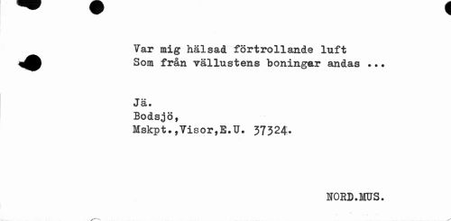 //// Var mig hälsad förtrollande luft Som från vällustens boningar andas . . . //// Jä. //// Bodsjö, //// Mskpt.,Visor,E.U. 37324. //// HORD.MUS. ////