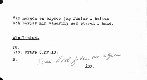 //// Var morgon en alpros jag fäster i hatten och börjar min vandring med staven i hand. //// Alpflickan. PO. //// 3*8, Brage 6,nr.l8. //// fe ////