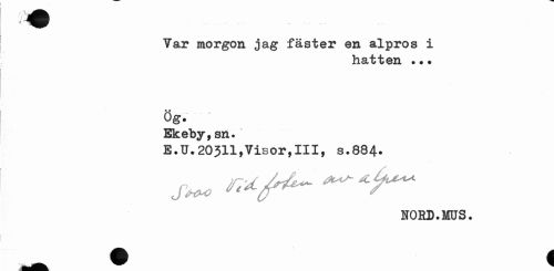 //// f, wr //// * //// Var morgon jag fäster en alpros i //// hatten ?•• //// Ög. //// Ekehy, sn. //// E.U.20311,Visor,III, s.884* //// NOHD.MUS. ////