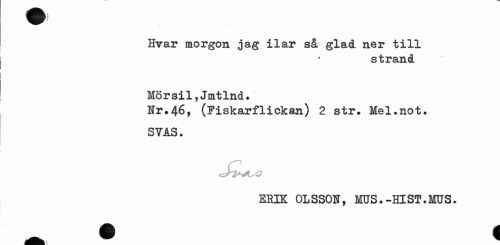 //// Hvar morgon jag ilar så glad ner till //// strand //// Mörsil,Jmtlnd. //// Nr.46, (Fiskarflickan) 2 str» Mel.not. SVAS. //// ERIK OLSSON, MUS.-HlST.MUS. ////