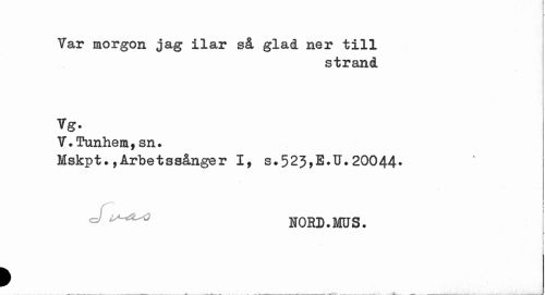 //// Var morgon jag ilar så glad ner till //// strand //// Vg. //// V.Tnnhem,sn. //// Mskpt., Arbets sånger I, s.523,E.U.20044* J u^o NORD.MUS. //// ¦u ¦ 1 ////
