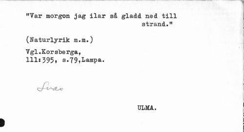 //// f,Var morgon jag ilar så gladd ned till //// strand.* //// .i //// (Naturlyrik m.m.) Vgl.Korsberga, //// 111:3951 s.79*kampa. //// ^J-t^tsc //// ULMA. //// > ////