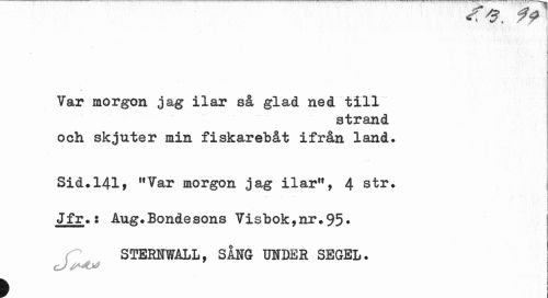 //// <r, 79 //// Var morgon jag ilar så glad ned till //// strand //// och skjuter min fiskarebåt ifrån land. //// Sid. 141 $ HVar morgon jag ilarM, 4 str. Jfr.: Aug.Bondesons Visbok,nr.95. //// STERNWALL, SANG UNDER SEGEL. ////
