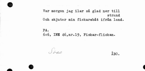 //// Var morgon jag ilar så glad ner till //// strand //// Och skjuter min fiskarebåt ifrån land. //// \ //// PA. //// 6:6, INE 46,nr.199 Fiskar-flickan. ////