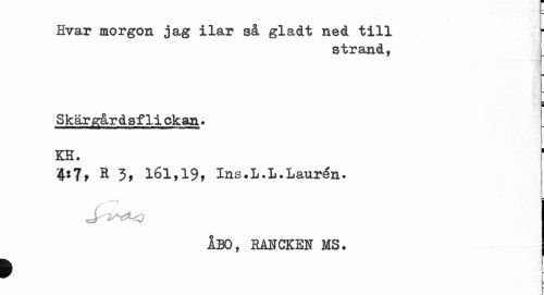 //// Hvar morgon jag ilar så glatt ned till //// strand, //// s ¦ //// Skärgårdsflickan* //// KH. i //// R 3> 161,19, Ins.L.L.Laurén. //// ABO, RåNCKEN MS. //// > ////