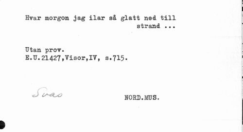 //// I //// Hvar morgon jag ilar så glatt ned till //// strand *•? //// Utan prov. //// E.U.21427,Visor,IV, s.715. //// 1 //// 1 //// [ //// L t //// I //// n 1 //// ^ NORD.IHJS. //// \ ////