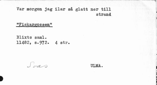 //// Var morgon jag ilar så glatt ner till //// strand //// ¦ //// "Fiskartössen" //// Blixts saml. 11482, s.972* 4 str» //// 1 //// ULMA. //// s //// > j //// - ////