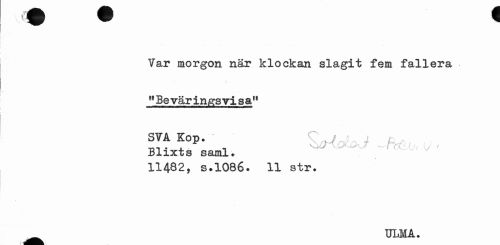 //// Var morgon när klockan slagit fem fallera 11 Be vär ing s vi s a11 //// SyAKop.- , //// Blixts saml. //// 11482, s.1086. 11 str. //// ULMA. ////