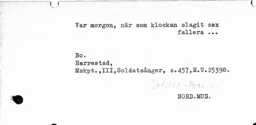 //// • • //// - w —. . A ' //// Var morgon, när som klockan slagit sex //// fallera ? • * //// Bo. //// Herrestad, //// Mskpt.,111,Soldatsånger, s.457>E.U.25598. //// - % i v< i/ , //// ^ NORD. MS. ////